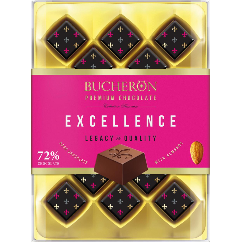 Вкус конфет Bucheron Excellence превосходит все ожидания. Они созданы из самых редких какао-бобов элитных сортов, имеющих яркий, насыщенный, богатый оттенками аромат. Сердце конфет, изысканная начинка с дробленым миндалем, бережно помещена в оправу из превосходного горького шоколада. Сочетание благородной сладости орехов и сбалансированной горечи шоколада доставит незабываемое удовольствие поклонникам утонченных кондитерских шедевров. Состав: горький шоколад (какао тертое, сахар, масло какао, какао-порошок, эмульгатор (лецитин соевый, Е476)), начинка (сахар, какао тертое, жир растительный, масло какао, молочный жир, ядро ореха миндаля жареное дробленое, эмульгатор (лецитин соевый, Е476), ароматизаторы). Шоколад горький содержит: общий сухой остаток какао - не менее 72,0%. Массовая доля насыщенных жирных кислот - 24,0%, массовая доля трансизомеров ненасыщенных жирных кислот - 0%. Общее содержание какао-продуктов в шоколадной массе - не менее 72,0%. Может содержать следы молочных продуктов, других видов орехов и арахиса. Пищевая ценность 100 г продукта (средние значения): белки - 6,0 г; жиры - 38,0 г; углеводы - 41,0 г. Энергетическая ценность (калорийность) (100 г): 530 ккал, 2210 кДж. Срок годности: 18 месяцев. Хранить при температуре от +5°C до +22°C и относительной влажности воздуха не более 70%. Не подвергать воздействию прямого солнечного света. Страна производства: Россия.