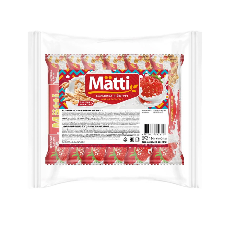 Батончик-мюсли Matti Клубника и йогурт - злаковый батончик с добавлением воздушного риса, ягод и белой глазури. Хрустящий батончик зарядит энергией злаков и наполнит день ярким вкусом. Состав: смесь злаковая (хлопья мультизерновые (крупа (мука) овсяная, рисовая, мука пшеничная из цельносмолотого зерна, крупа (мука) гречневая, сахар, глюкоза, экстракт ячменно - солодовый, соль), хлопья овсяные, рис воздушный зернышки (крупа рисовая, сахар, соль)); глазурь белая (сахар, заменитель масла какао лауринового типа, сухое цельное молоко, сухая молочная сыворотка, эмульгатор - лецитин соевый, ароматизатор 'Ванилин'); патока карамельная; сироп глюкозно - фруктозный; сахар; яблоко сушеное; концентрат (экстракт) ячменно - солодовый светлый; клубника сушеная; масло кокосовое; натуральный ароматизатор 'Клубника'; регулятор кислотности - кислота лимонная; йогуртовый порошок. Может содержать следы орехов. Пищевая ценность: белки 5,5 г; жиры 11 г; углеводы 71 г. Энергетическая ценность: 400 ккал. Срок годности: 13 месяцев. Условия хранения: хранить в сухом месте при температуре не выше 25°С и относительной влажности воздуха не более 75%. Вес: 144 г (6 батончиков по 24 г). Страна производства: Россия.