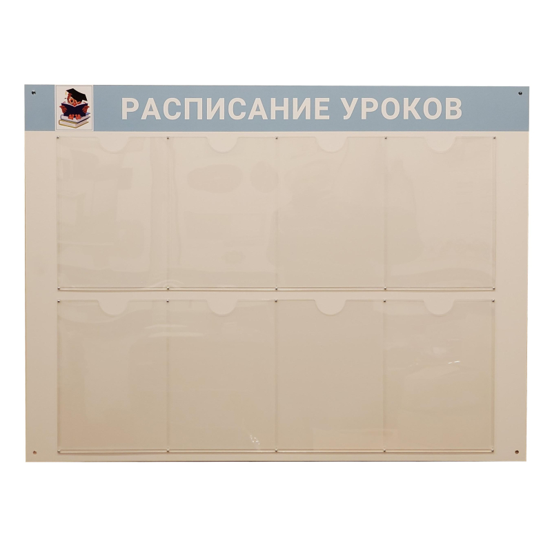 Расписание уроков важная информация для учеников начальной и средней школы. Стенд состоит из 8 прозрачных карманов А4, куда можно вставлять информащию об уроках, кружках, факультативов и прочее.