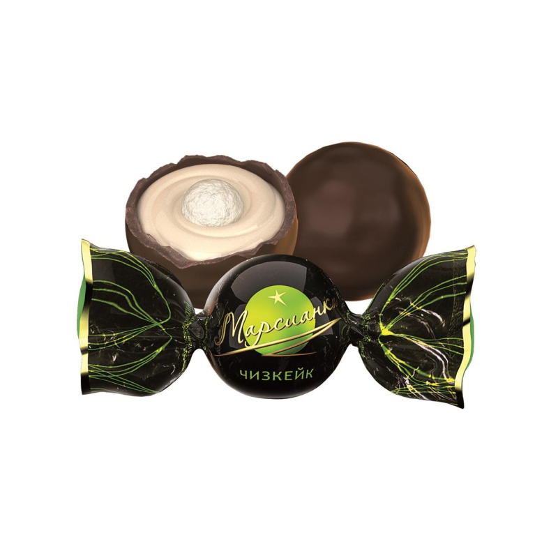 Конфеты Марсианка 'Чизкейк', подходящие в качестве десерта к чаю или кофе. Внутри слоя нежнейшей шоколадной глазури имеется начинка из нежного сливочного крема с ароматом десерта Чизкейк, а также хрустящий шарик криспи. Конфеты шарообразной формы упакованы в пленку с традиционным оформлением. Вес: 1000 г. Состав: сахар, жиры растительные, сыворотка молочная сухая деминерализованная, какао-порошок, рис воздушный (крупа рисовая, сахар, мука пшеничная, соль), патока, эмульгаторы: лецитин соевый, Е492; стабилизатор гуммиарабик, ароматизаторы. Пищевая ценность 100 г продукта (среднее значение): белки - 2,5 г, жиры - 38 г, углеводы - 55 г. Энергетическая ценность 100 г продукта (среднее значение): 2390 кДж, 570 ккал. Срок годности: 9 месяцев. Хранить при температуре от 15 до 21°С, относительной влажности воздуха не более 75% в сухих, чистых, хорошо вентилируемых помещениях. Не подвергать воздействию прямых солнечных лучей. Страна производства: Россия.