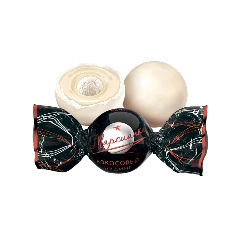 Конфеты Марсианка 'Кокосовый пудинг', подходящие в качестве десерта к чаю или кофе. Внутри слоя нежнейшей шоколадной глазури имеется начинка из нежного сливочного крема с ароматом кокоса, а также хрустящий шарик криспи. Конфеты шарообразной формы упакованы в пленку с традиционным оформлением. Вес: 1000 г. Состав: сахар, жиры растительные, сыворотка молочная сухая деминерализованная, кокосовая стружка, патока, рис воздушный (крупа рисовая, сахар, мука пшеничная, соль), эмульгаторы: лецитин соевый, Е492; ароматизаторы. Пищевая ценность 100 г продукта (среднее значение): белки - 3,5 г, жиры - 41 г, углеводы - 53 г. Энергетическая ценность 100 г продукта (среднее значение): 2480 кДж, 590 ккал. Срок годности: 9 месяцев. Хранить при температуре от 15 до 21°С, относительной влажности воздуха не более 75% в сухих, чистых, хорошо вентилируемых помещениях. Не подвергать воздействию прямых солнечных лучей. Страна производства: Россия.