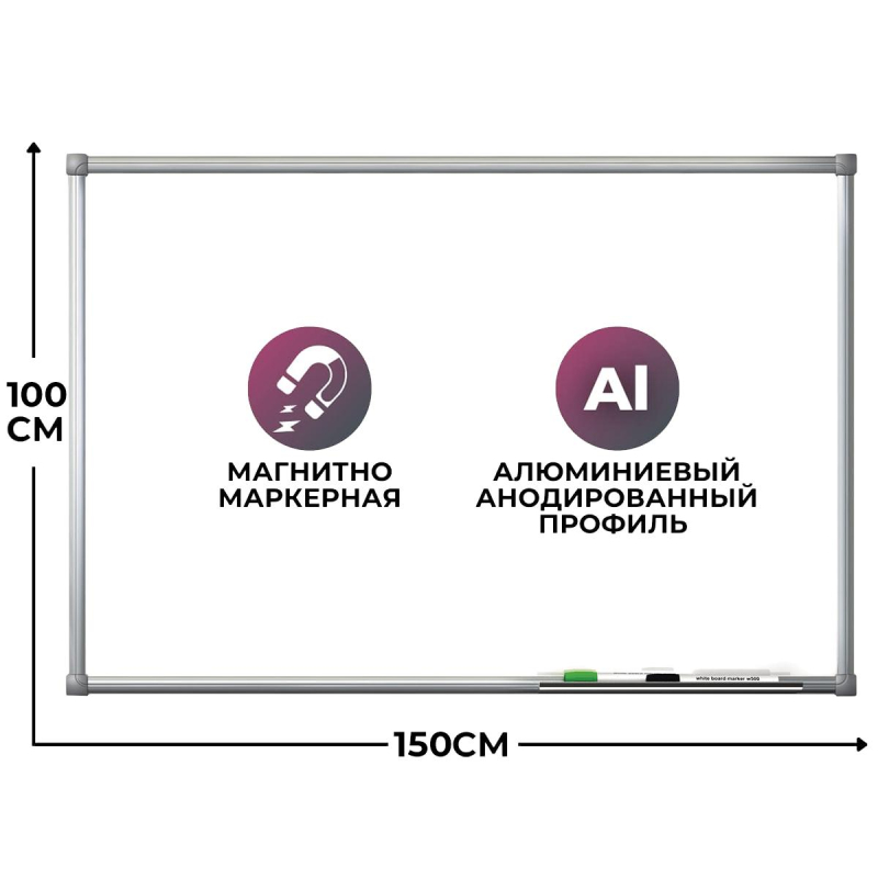 Доска магнитно-маркерная с эмалевым покрытием обеспечивает превосходную стираемость, стойкость к царапинам и длительный срок службы изделия. Супергладкая поверхность доски обеспечивает меньшее искажение от отражаемого света. Доска магнитно-маркерная предназначена для использования маркеров сухого стирания и магнитов для фиксации сообщений. Под стиль Вашего офиса могут быть установлены 3 варианта угловых заглушек на выбор (красные, синие или темно-серые). Магнитно-маркерная доска поставляется в комплекте: крепеж, полочка для маркеров, 3 комплекта уголков. Возможно как вертикальное, так и горизонтальное крепление. Страна производства Россия. Гарантия 1 год. Долговечное эмалевое покрытие. Соблюдение правил ухода и эксплуатации способно обеспечить срок службы эмалевой рабочей поверхности магнитно-маркерной доски более 25 лет. Эко-выбор. За счет использования премиум профиля овального сечения шириной 21 мм конструкция доски имеет увеличенную прочность и надежность. Размер рабочей поверхности: 96.7x148 см. Размер доски (ВхШ): 100x150 см. Для удаления пленки потяните за верхний свободный угол, пленка легко отойдет от рабочей поверхности. При необходимости проведите вдоль рамы канцелярским ножом.
