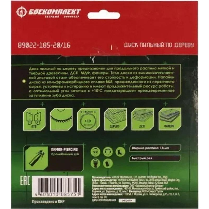 Диск пильный по дереву Боекомплект 185x20/16 мм 36Т (B9022-185-20/16-36)  имеет 36 зубьев.