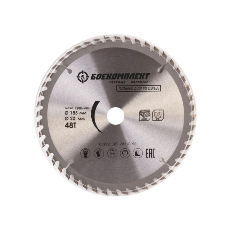 Диск пильный Боекомплект B9022-185-20/16-48. Диск пильный по дереву предназначен для продольного и поперечного распила мягкой и твердой древесины, ДСП, МДФ, фанеры. Тело диска из высококачественной листовой стали обеспечивает его стойкость к деформации. Напайки диска из вольфрамкарбидного сплава ВК8, произведенного из первичного сырья, устойчивы к истиранию и имеют продолжительный ресурс работы, а оптимальный угол заточки в +10 ?C предотвращает преждевременное затупление зуба диска.