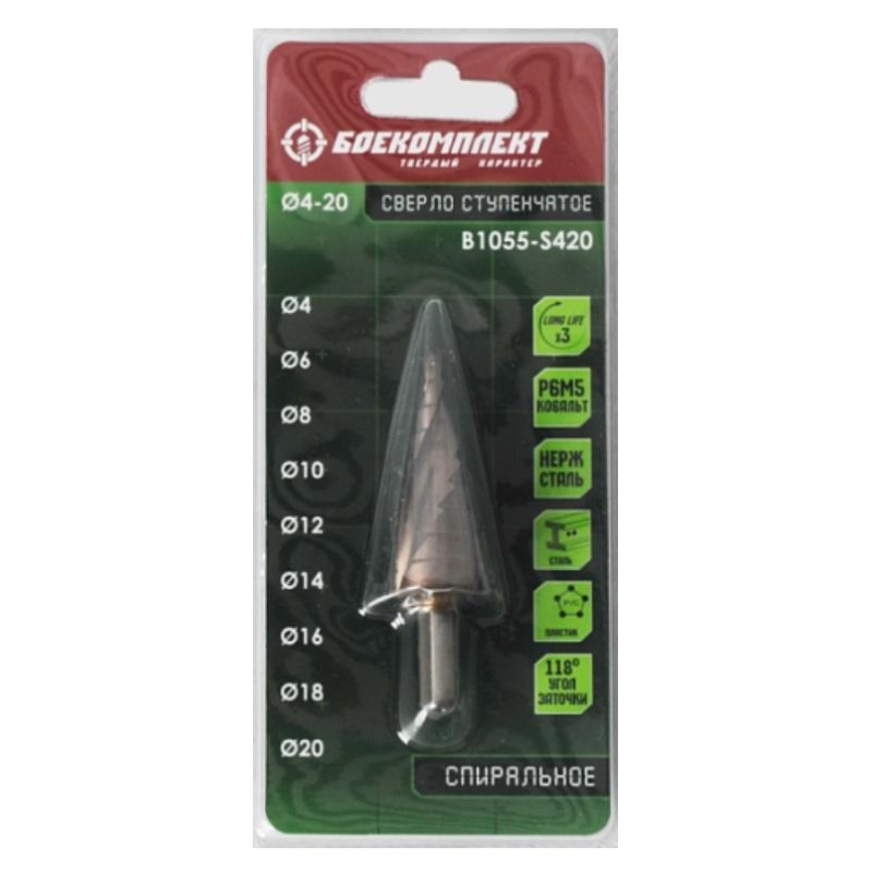 Сверло ступенчатое по металлу Боекомплект B1055-S420 4-20x33 мм изготовлено из быстрорежущей стали Р6М5, что обеспечивает ровные края отверстия и высокую износостойкость. Кобальтовое покрытие для повышенный поверхностной стойкости, перегрева и коррозии. Спиральное строение тела для более быстрого вывода металлической стружки по сравнению с моделями с прямой проточкой.