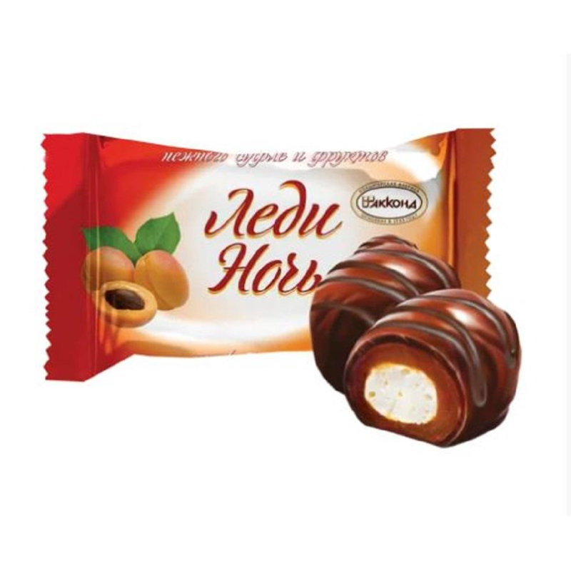 Конфеты шоколадные Акконд Леди Ночь с курагой 500 г. Состав: сахар, курага, патока, цельное сгущенное молоко с сахаром (молоко цельное, молоко обезжиренное, сахар - сахароза, лактоза), какао-продукты (какао-порошок, тертое какао), эквивалент масла какао (на основе растительных масел - пальмовое и ши), влагоудерживающий агент - сорбитовый сироп, рафинированные дезодорированные растительные масла (на основе пальмового и его фракций, подсолнечного, пальмоядрового, антиокислитель - альфа-Токоферол), белок яичный, сухое обезжиренное молоко, сыворотка сухая молочная, желирующий агент - агар, эмульгатор - соевый лецитин, обезжиренный молочный жир (пастеризованное молоко), ароматизаторы, антиокислители - аскорбиновая кислота, соль. Энергетическая ценность: 354 ккал. Пищевая ценность: белки - 3,5 г, жиры - 12 г, углеводы - 58 г. Срок годности: 6 месяцев. Хранить при температуре от +15°С до +21°С. Страна производства: Россия.