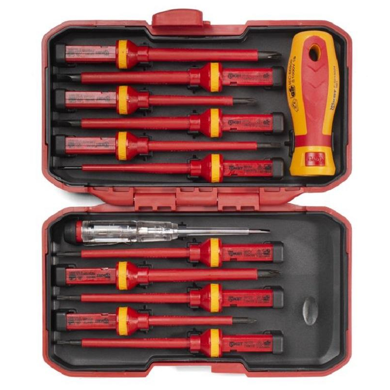 Набор инструмента электромонтажный КВТ Профи НИО-4412 для работы под напряжением до 1000 В. Материал стержня биты: хром-ванадиевая сталь. Вороненые намагниченные наконечники. Материал изоляции биты: полипропилен. На каждой бите - маркировка типоразмера. Двухкомпонентная рукоятка с мягкими вставками из термопластрезины. Патентованный пружинный механизм фиксации биты в рукоятке. Состав набора: Диэлектрическая бита: шлиц 3.0 х 100; Диэлектрическая бита: шлиц 4.0 х 100; Диэлектрическая бита: шлиц 5.5 х 100; Диэлектрическая бита: шлиц 6.5 х 100; Диэлектрическая бита: PH1х80; Диэлектрическая бита: PH2х100; Диэлектрическая бита: PZ1х80; Диэлектрическая бита: PZ2х100; Диэлектрическая бита: Т10х100; Диэлектрическая бита: Т15х100; Диэлектрическая бита: Т20х100; Тестер напряжения 110-250 В. Упаковка: пластиковый кейс. Вес набора: 840 г. Габариты кейса: 220х135х50 мм. Внешний вид и/или характеристики товара могут быть изменены производителем в соответствии с производственным процессом.