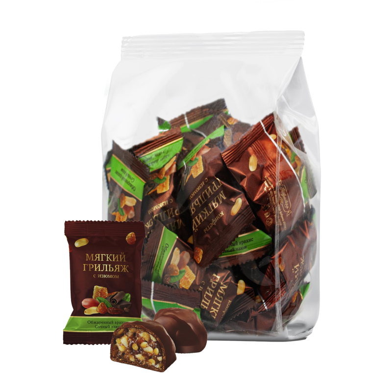 Дробленый арахис средней прожарки с отборным изюмом, наполненный глубоким ароматом меда, облаченный в темную глазурь. Состав: изюм, арахис жареный дробленый; сахар; мед искусственный (сахар, патока крахмальная, регуляторы кислотности: кислота лимонная, гидрокарбонат натрия, ароматизатор 'Мед'); патока крахмальная; жир кондитерский (рафинированные дезодорированные растительные масла: подсолнечное, пальмовое; эмульгатор: соевый лецитин Е322; антиокислители: Е319, Е330); ароматизатор ванилин; глазурь (сахар; заменитель масла какао нетемперируемый нелауринового типа (рафинированные дезодорированные растительные масла в натуральном и модифицированном виде, в том числе соевое, эмульгаторы Е492, Е322, антиокислитель Е306); какао-порошок; эмульгатор: лецитин соевый; комплексная пищевая добавка - антиокислитель (эмульгатор Е432, вода очищенная, антиокислитель: Е300, триглицериды жирных кислот, антиокислитель: Е307); ароматизатор ванилин). Продукт может содержать следы орехов, глютена пшеницы, молочных продуктов, яичных продуктов. Пищевая ценность: белки - 6 г, жиры - 20 г, углеводы - 60 г. Энергетическая ценность: 1840 кДж, 440 ккал. Срок годности: 8 месяцев. Условия хранения: влажность не более 75%, температура от 15°С до 21°С. Масса нетто: 500 г. АО "Кондитерская фабрика "Пермская", Россия.