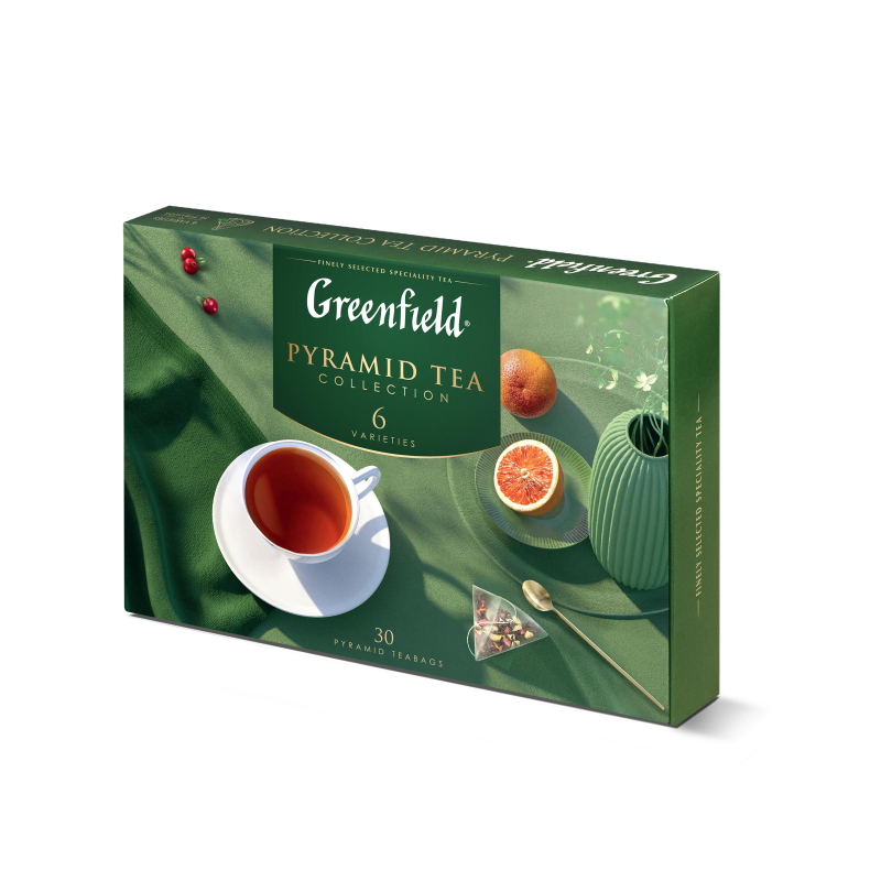 Коллекция листового чая Greenfield в пирамидках, 6 эксклюзивных вкусов - ярких и нежных, интригующих и насыщенных. Прекрасная возможность оценить все разнообразие Greenfield. Состав: Рич Цейлон: чай черный байховый цейлонский; Роял Эрл Грей: чай черный байховый, цедра цитрусовых, ароматизатор "бергамот"; Рэдберри Крамбл: чай черный байховый, корица, брусника, лист черной смородины, ананас, лепестки цветков апельсина, яблоко, ароматизатор "брусничный пирог"; Сицилиан Цитрус: чай черный байховый, цедра лимона, цедра лимона, цедра апельсина, лепестки календулы, шиповник, ароматизатор "сицилийский апельсин"; Классик Генмайча: чай зеленый байховый, воздушный рис; Милки Оолонг: чай оолонг байховый, натуральный ароматизатор "молоко", лепестки мальвы. Способ приготовления: заварить чайный пакетик в чашке кипяченой водой и настоять 5 минут. Количество пакетиков в упаковке: 30 штук. Тип упаковки: картонная. Хранить в чистом, хорошо вентилируемом помещении без посторонних запахов с относительной влажностью воздуха не выше 70%. Страна производства: Россия.