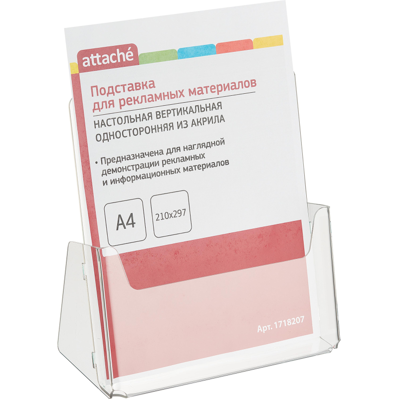 Вертикальная односторонняя настольная подставка Attache формата А4. Поставляется в защитной пленке. Вмещает стопку информационных материалов толщиной до 32 мм. Имеет низкий борт для легкого излечения брошюр или листовок. Материал - бесцветное прозрачное акриловое оргстекло. В упаковке 1 подставка. Размеры изделия (ВxШxГ): 235x215x110 мм.
