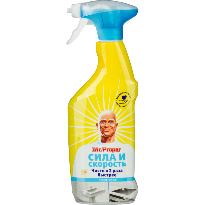 Универсальное чистящее средство Mr. Proper Лимон жидкость 500 мл Назначение. Спрей для уборки Mr. Proper - универсальное средство с ароматом лимона. Это концентрат для уборки ванной и кухни, в частности для очищения кухонной столешницы, плиты, раковины, смесителя, ванны, унитаза, кафельной плитки, а также предметов из нержавеющей стали, хрома и керамики. Это эффективное средство для удаления застарелого жира, грязи и въевшихся пятен. Вас порадует эффект: чистящий спрей 'Мистер Пропер' оставляет после себя блеск и приятный аромат лимона, не оставляет разводов. Способ применения. Встряхнуть перед использованием. Распылите спрей на влажную тряпку или на саму поверхность. Потрите. Для всех поверхностей, которые не соприкасаются с едой, смывание средства не требуется. Меры предосторожности. Внимание. Вызывает серьезное раздражение глаз. Беречь от детей. При попадании в глаза: осторожно промыть большим количеством воды в течение нескольких минут. Не вдыхать пары. Состав.