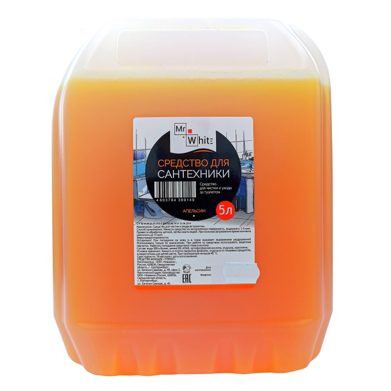 Средство для сантехники Mr.White 5 л Назначение. Средство для чистки и ухода за туалетом. Способ применения. Нанести средство на загрязненную поверхность, выдержать 3-5 мин. Провести обработку щеткой, затем смыть водой. При сильном загрязнении время контакта увеличить до 15 мин. Меры предосторожности. Осторожно! При попадании на кожу и в глаза вызывает выраженное раздражение! Содержит кислоту! Использовать только по назначению. При работе со средством использовать защитные перчатки. Избегать попадания средства в глаза и на кожу. Состав. Вода 30% и более, менее 5%: АПАВ, ортофосфорная кислота, отдушка, краситель. Условия хранения. Хранить в плотно закрытом флаконе, отдельно от пищевых продуктов, в недоступном для детей месте. При температуре не выше 40°C. Срок годности. 18 месяцев с даты изготовления. Относится к сегменту 'суперэконом' - товар с минимальными требованиями к качеству для тех, кто хочет сэкономить. Товар отвечает основным потребительским характеристикам.
