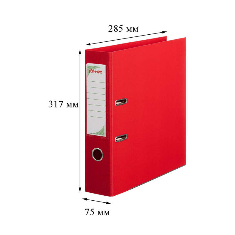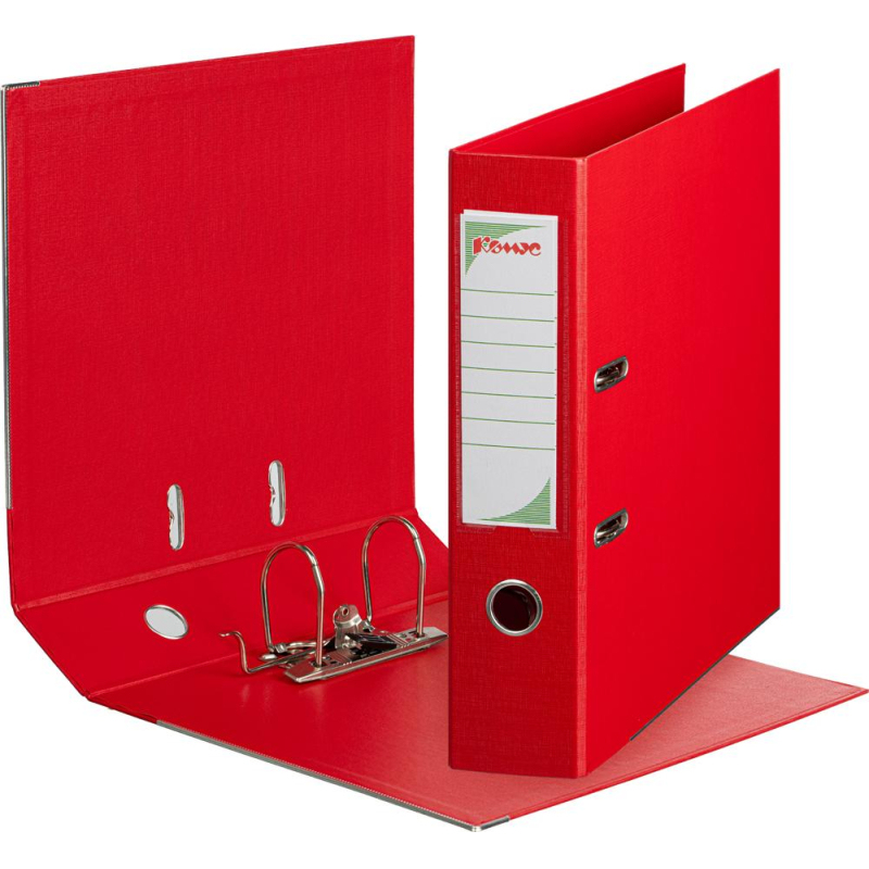 Папка-регистратор с арочным механизмом 'Комус' изготовлена из картона, с внешней и внутренней стороны оклеена бумвинилом красного цвета. Формат А4. Арочный механизм произведен в Чехии. Нижние края защищены от повреждений металлическим кантом. Благодаря прорезям для колец на внешней крышке папка остается закрытой даже при большом количестве бумаг. На корешке шириной 75 мм имеется карман со сменной этикеткой и кольцо для захвата. Папка-регистратор 'Комус' вмещает до 480 листов стандартной плотности.