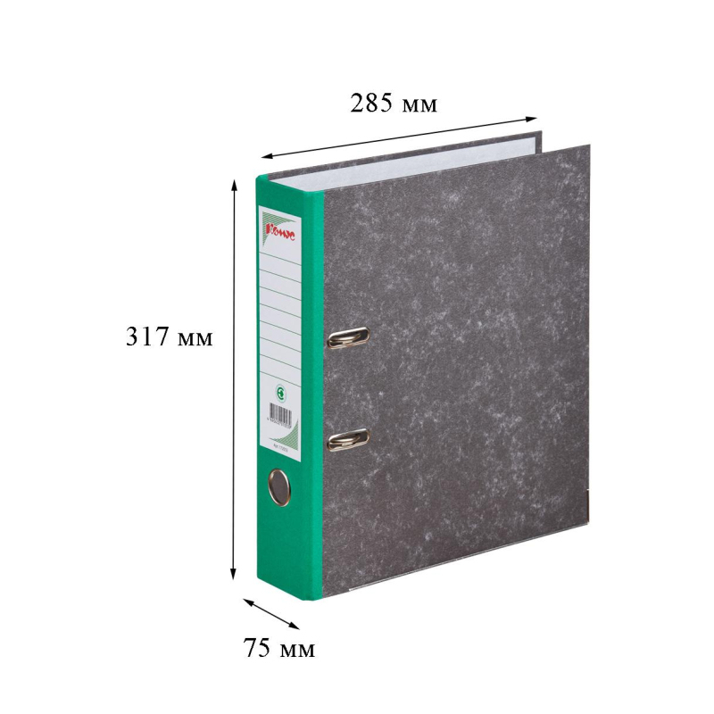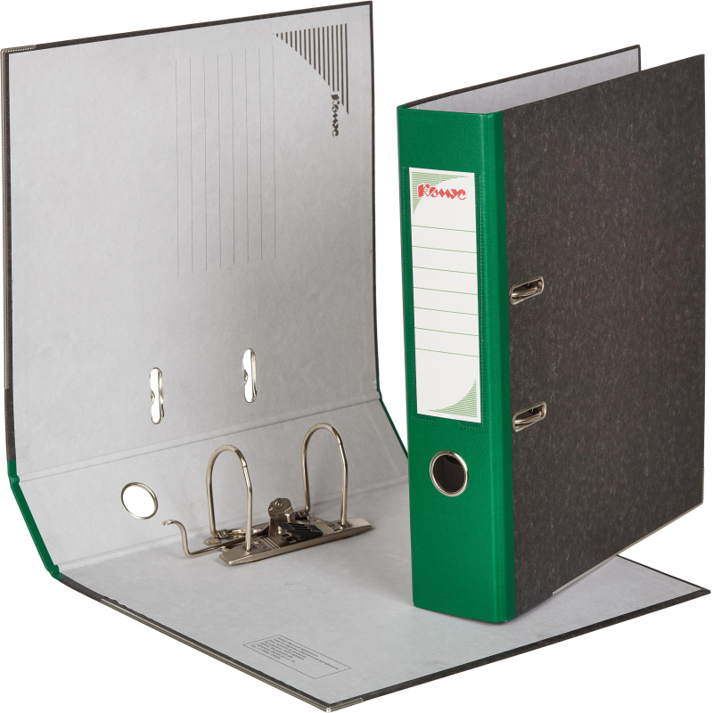 Папка-регистратор с арочным механизмом Комус формата А4 изготовлена из плотного картона, покрытого фактурной бумагой под мрамор, производства Великобритания. Арочный механизм произведен в Чехии. Нижние края защищены металлическим кантом. Корешок зеленого цвета, ширина - 75 мм. Специальные прорези на крышке не дают папке открываться при большом количестве вложенных документов. На корешок наклеена этикетка, есть кольцо для удобного захвата. Папка-регистратор Комус вмещает до 480 листов стандартной плотности.