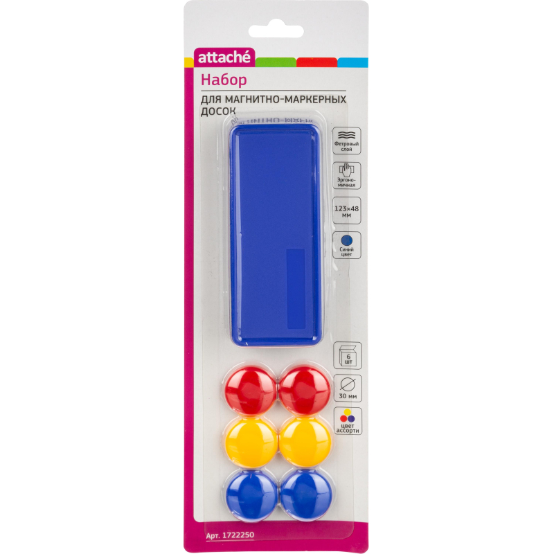 Набор для магнитно-маркерных досок Attache состоит из: губки-стирателя, 6 магнитных держателей. Губка предназначена для стирания маркеров с магнитно-маркерных досок сухим способом. Магнитные держатели для досок предназначены для фиксирования информации на металлических поверхностях магнитно-маркерных досок, флипчартов или витрин. Диаметр 30 мм. Цвет губки синий, цвет магнитов в ассортименте.