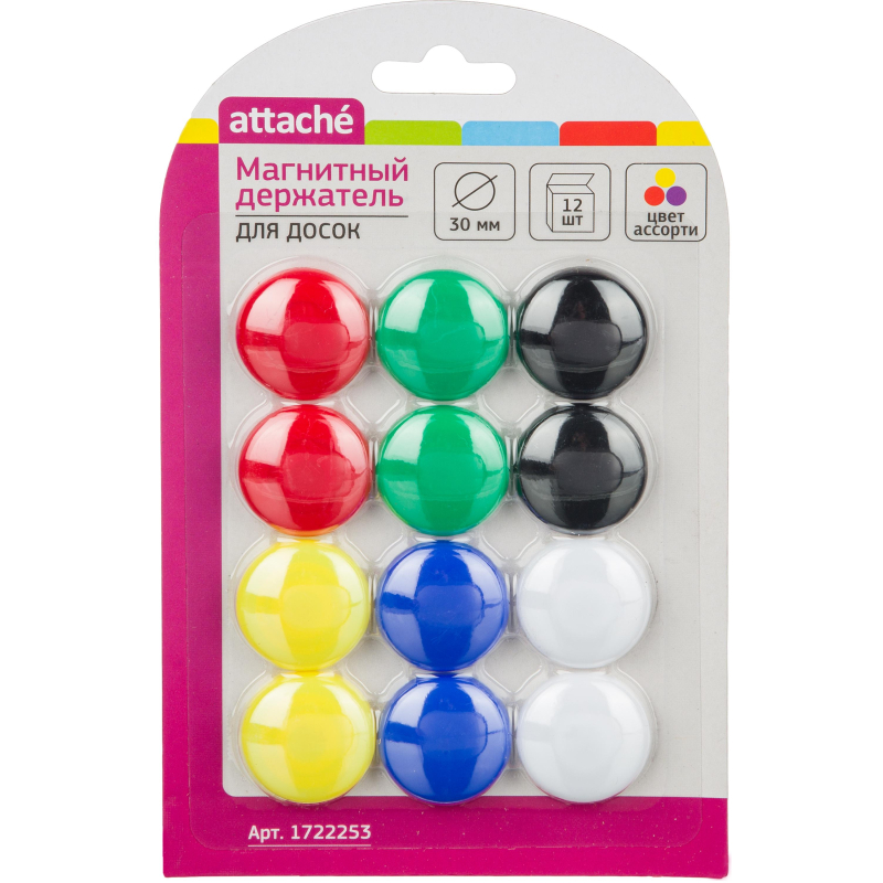 Магнитные держатели для досок Attache предназначены для фиксирования информации на металлических поверхностях магнитно-маркерных досок, флипчартов или витрин. Диаметр магнитов 30 мм. Поставляются по 12 штук в упаковке. Цвет изделий-ассорти.