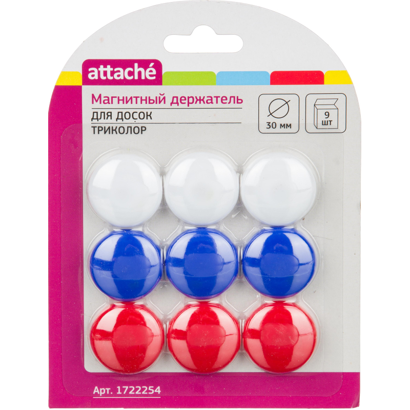 Магнитные держатели для досок Attache Триколор предназначены для фиксирования информации на металлических поверхностях магнитно-маркерных досок, флипчартов или витрин. Диаметр магнитов 30 мм. Поставляются по 9 штук в упаковке. Цвет изделий-ассорти.