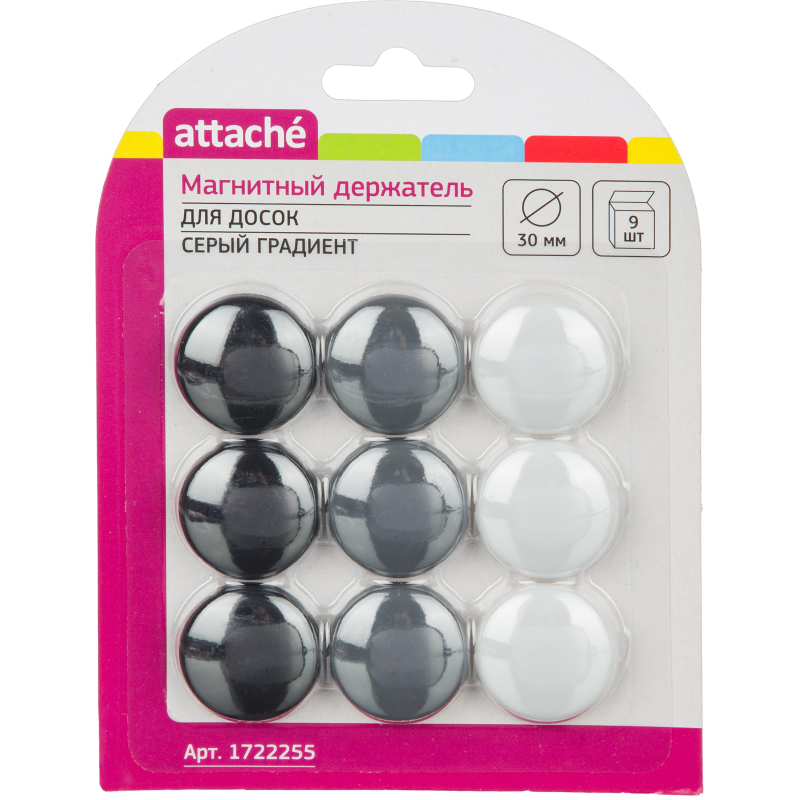 Магнитные держатели для досок Attache предназначены для фиксирования информации на металлических поверхностях магнитно-маркерных досок, флипчартов или витрин. Диаметр магнитов 30 мм. Поставляются по 9 штук в упаковке. Цвет изделий- серый градиент.