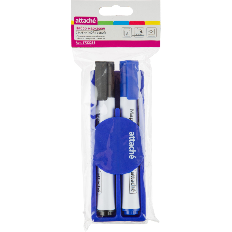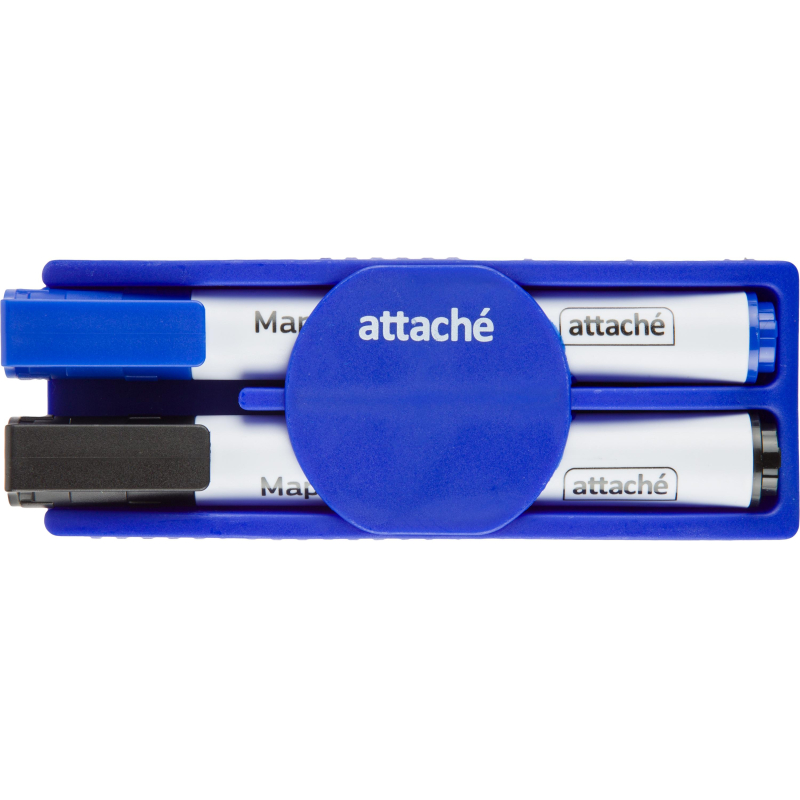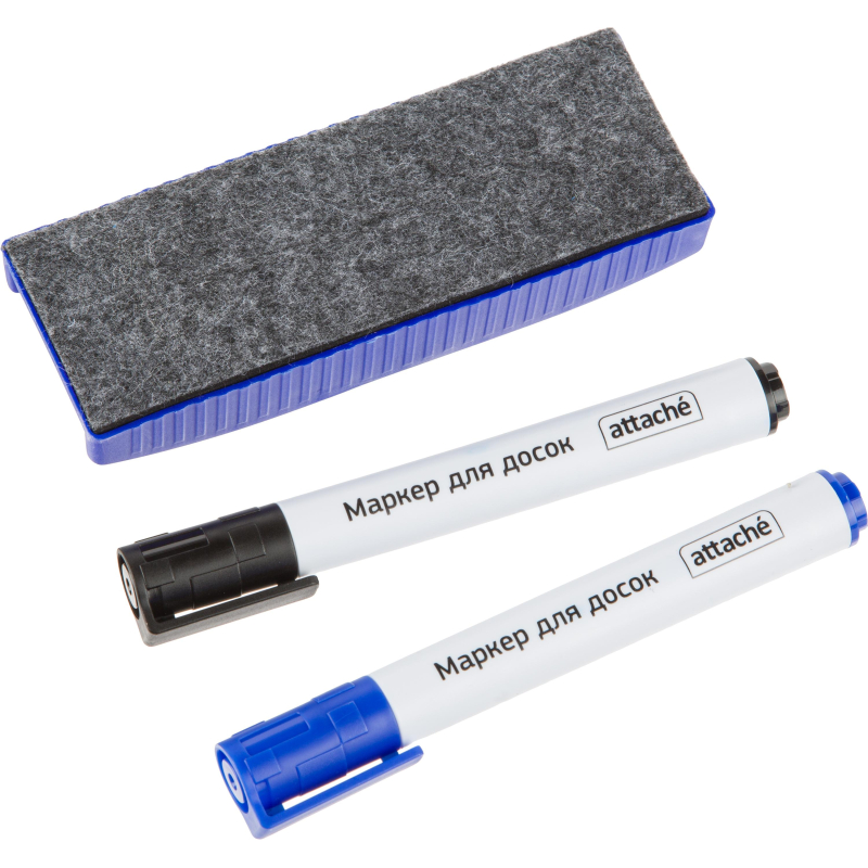 Набор принадлежностей для магнитно-маркерной доски Attache предназначен для офиса и дома. В составе набора: синий магнитный стиратель, черный и синий маркеры для доски. Стиратель имеет эргономичную форму, поэтому его удобно держать в руке, кроме того, имеет встроенные крепления для маркеров. Фетровый слой хорошо стирает следы от маркера с доски. При помощи встроенного магнита, стиратель крепится к доске в любом удобном месте.