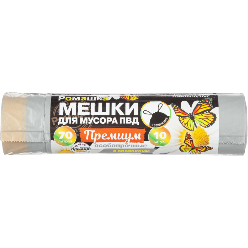 Мешки для мусора на 70 л с завязками Ромашка серые (ПВД, 35 мкм, в рулоне 10 штук, 65х74 см) Подходят для легкого мусора. Данные пакеты нашли широкое применение в домашнем использовании, в офисе, государственных учреждениях (поликлиниках, школах, детских садах и пр.), санаториях, гостиницах, барах, ресторанах, кафе. Наличие завязок обеспечивает удобство в их использовании. Изготовлены из полиэтилена высокого давления (ПВД) плотностью 35 мкм, объем 70 литров. Упакованы по 10 пакетов в рулоне. Цвет: серый. Размер (ШхД): 65х74 см.