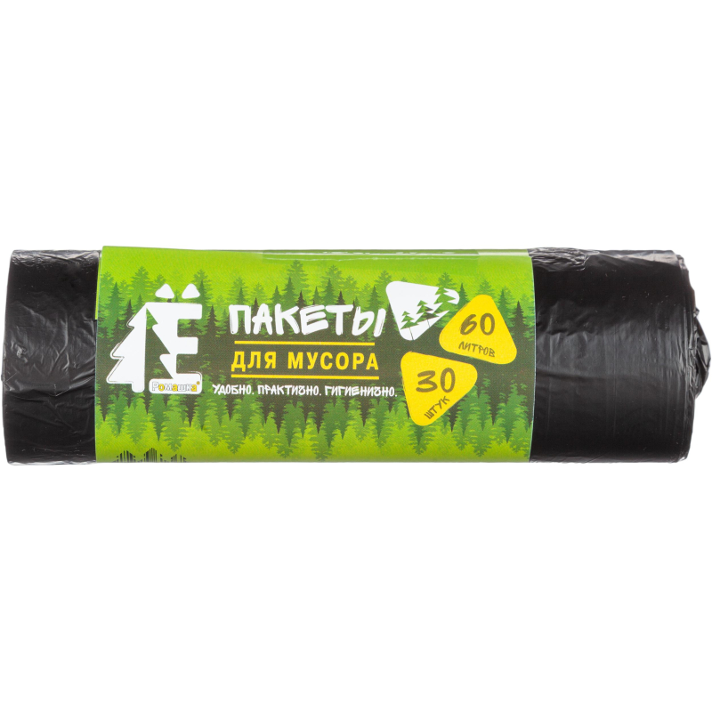 Мешки для мусора на 60 л Элементари черные (ПНД, в рулоне 30 штук, 58х68 см) Подходят для легкого мусора. Данные пакеты нашли широкое применение в домашнем использовании, в офисе, государственных учреждениях (поликлиниках, школах, детских садах и пр.), санаториях, гостиницах, барах, ресторанах, кафе. Предназначены для сбора и транспортировки бытового мусора. Изготовлены из полиэтилена низкого давления (ПНД), объем 60 литров. Упакованы по 30 пакетов в рулоне. Цвет: черный. Размер (ШхД): 58x68 см.