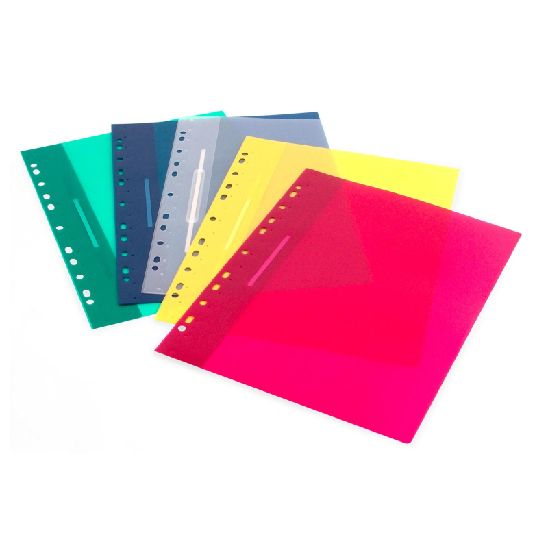 Скоросшиватель используется для хранения различного рода документации, для ведения документооборота, систематизации договоров, других важных бумаг. Дополнительные отверстия на корешке позволяют подшить скоросшиватель к папке. Скоросшиватель изготовлен из пластика с фактурой "песок". Толщина пластика - 180 мкм. Вместимость - 100 листов стандартной плотности. Цвет- ассорти (зеленый, синий, желтый, красный, прозрачный). Комплект из 10 штук (2 папки каждого цвета). Товар поставляется в нескольких вариантах цвета/дизайна (без возможности выбора).