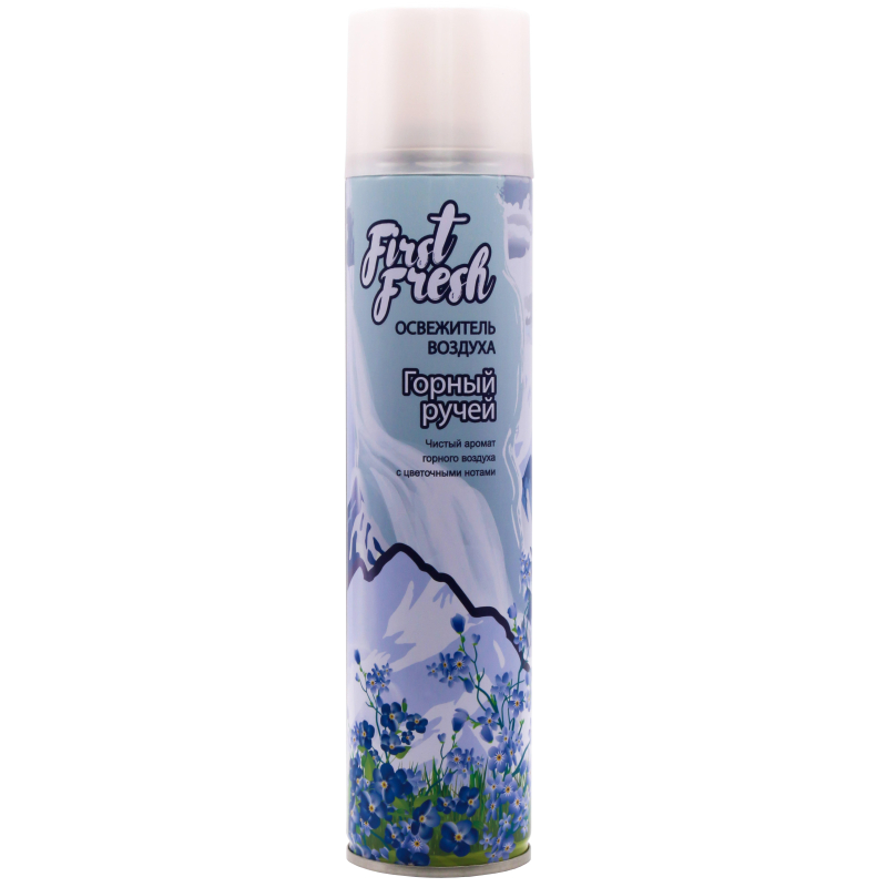 Освежитель воздуха First Fresh Горный ручей 300 мл Назначение/особенности: предназначен для устранения неприятных запахов в различных помещениях. Способ применения: баллон встряхнуть в течение 3-5 секунд. Держа баллон вертикально распылить вверх ближе к центру помещения в течение 2-3 секунд. При необходимости более длительного распыления баллон периодически встряхивать. Меры предосторожности: осторожно. Воспламеняющийся аэрозоль! Содержимое баллона находится под давлением. При нагревании возможен взрыв. Предохранять от действия прямых солнечных лучей и нагревания выше 40?С. Не вскрывать и не сжигать даже после использования! Не распылять вблизи открытого огня, источников тепла и раскаленных предметов! Не курить! Избегать попадания в глаза. Не разбирать и не давать детям. Состав: деионизированная вода (30% и более), пропан/бутан/изобутан (30% и более), парфюмерная композиция (5% и менее), сорбитана монолаурат (5% и менее), натрия нитрит (5% и менее), бензоат натрия (5% и менее). ТУ 2389-001-87957643-2009 или ГОСТ 32481-2013. Условия хранения: хранить при температуре от +5°С до +40°С. Использованные баллоны и баллоны с истекшим сроком годности утилизировать как бытовые отходы. Не содержит озоноразрушающих веществ. Срок годности: 36 месяцев с даты изготовления. Относится к сегменту 'суперэконом' - товар с минимальными требованиями к качеству для тех, кто хочет сэкономить. Товар отвечает основным потребительским характеристикам. Номинальный объем - 300 мл, вес нетто - 150 г.