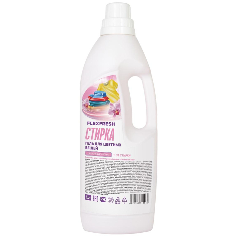 Гель для стирки Flexfresh Цветочный аромат 1 л Назначение: средство подходит для стирки белого и цветного белья из хлопка, шерсти и синтетических тканей. Способ применения: после длительного хранения перед употреблением взболтать. Добавьте гель в отсек для моющего средства стиральной машины, либо непосредственно в барабан с бельем, запустите 'стирку в соответствии с инструкцией для вашей модели. Машинная стирка: белье умеренного загрязнения или неполная загрузка (до 3 кг) - 30 мл; белье сильного загрязнения или полная загрузка (4-6 кг) - 60 мл. Ручная стирка: 30 мл геля на 5 л воды. Соблюдайте указания по уходу, размещенные на ярлыках изделий. При сильных загрязнениях рекомендуется использовать пятновыводитель. Вещи, степень устойчивости окраски которых неизвестна, стирать отдельно. Во избежание изменения цвета окрашенных тканей избегать длительного замачивания. Объем колпачка (крышки) составляет 30 мл. Меры предосторожности: использовать строго по назначению! Избегать попадания в глаза, на слизистые оболочки и поврежденные участки кожи, в случае попадания обильно промыть водой. Не употреблять внутрь! В случае проглатывания незамедлительно обратиться за медицинской помощью. Избегать длительного контакта моющего средства с кожей, при ручной стирке рекомендуется использовать резиновые перчатки. Состав: >30% вода очищенная; 5-15%: анионные ПАВ;