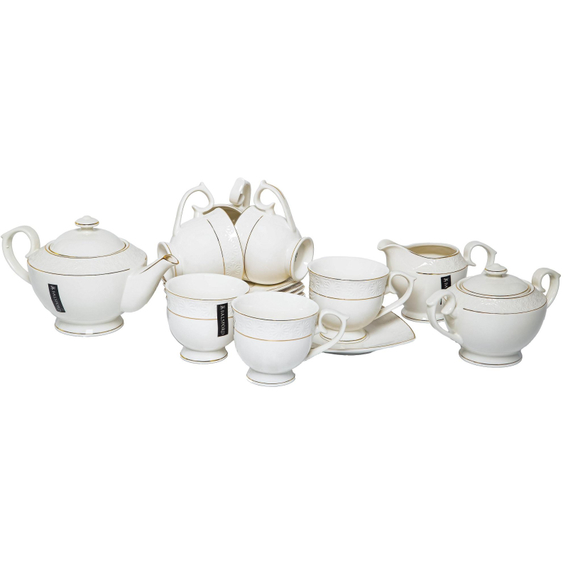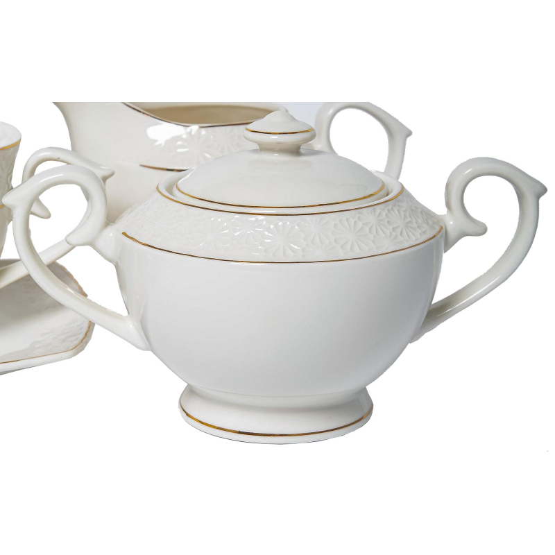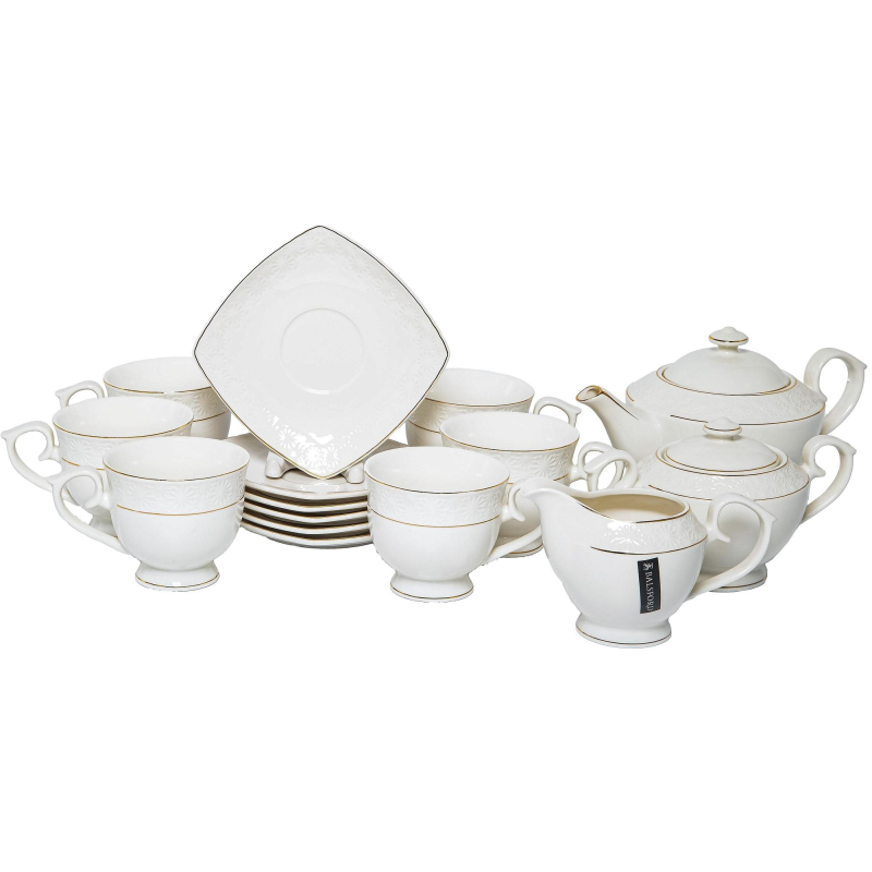 Сервиз чайный Грация Нежность на 6 персон фарфор (15 предметов). Чайный сервиз несомненно украсит ваш праздничный стол во время любого торжества и прекрасно подойдет на каждый день за завтраком для чая, какао, горячего шоколада и кофе. Издавна фарфор является признаком роскоши и достатка, владельцы такой посуды - люди с тонким и уникальным вкусом.Сервиз выполнен из высококлассного упрочненного фарфора ресторанного класса New Bone, который обладает повышенной прочностью, легкостью, защищен от сколов и царапин. Получите эстетическое удовольствие от его использования! Вы будете приятно удивлены его превосходным качеством и красотой исполнения. Это прекрасная готовая идея подарка в красивой подарочной упаковке с бантом на свадьбу друзей и родственников, новый год, день рождения любимой жены, девушки, мамы, сестры, подруги, юбилей бабушки и дедушки, годовщина свадьбы родителей, молодоженам, на день знаний для преподавателя, учителя и педагога. Состав сервиза: 6 чашек, 6 блюдец, чайник, сахарница, молочник. Объем чашки: 300 мл.