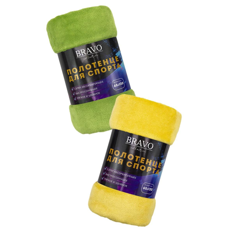 Набор полотенец велюровых Bravo Спорт 2 штуки 65х130 см 400 г/кв.м зеленые/желтые. Полотенца из микрофибры ''Спорт'' произведены в Китае. Полотенца ''Спорт'' производятся по современной технологии, без ущерба для экологии, они мягкие, не электризуются, быстро впитывают влагу. Они очень популярны среди посетителей фитнес-клубов и бассейнов, но могут отлично использоваться и в поездках, и на пляже, и дома. Размер полотенца: 65х130 см - 2 штуки. Состав ткани: 80% полиэстер + 20% полиамид, плотность 400 г/кв.м. Рекомендации по уходу: бережная машинная стирка при температуре не выше 40°С. Упаковка: пакет. Внимание! Перед использованием обязательна стирка!