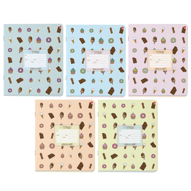 Школьные тетради в линейку на 24 листа с орнаментом из любимых детских сладостей: пончиков, шоколадок, капкейков. Обложка с красочной и качественной печатью выполнена из мелованной бумаги плотностью 115 г/кв.м. На лицевой стороне предусмотрено место для подписи. Бумажный блок состоит из ярко-белых листов в линейку с красными полями. Углы блока закруглены. Эти тетради идеально подходят для школьных работ и обязательно понравятся детям. Представлены в 5 вариантах цветового оформления: розовый, бежевый, нежно-фиолетовый, голубой и сиреневый. В упаковке 10 шт. Внимание! Товар поставляется в нескольких вариантах цвета/дизайна (без возможности выбора).