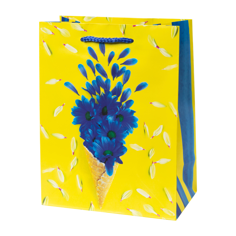 Бумажный пакет "Цветы на желтом" для сувенирной продукции с ламинацией, с шириной основания 17,8 cм, плотность бумаги 140 г/м2. Размер: 17,8x22,9x9,8 см.