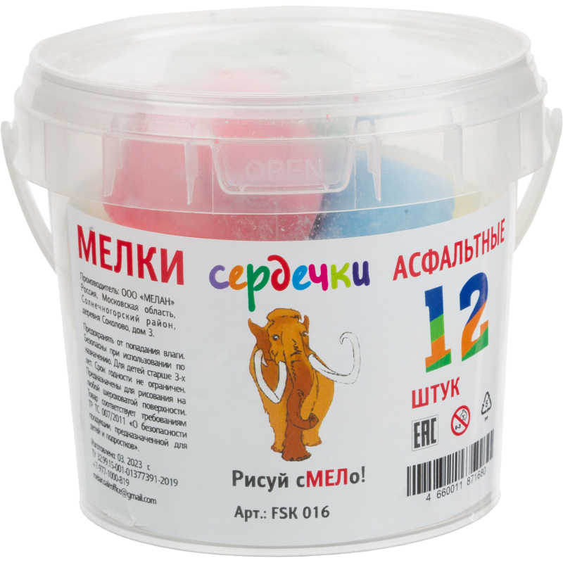 Набор из 12 ярких цветных мелков для рисования на асфальте в форме сердечек. Прекрасный подарок для ребенка. Мел изготовлен из натуральных материалов, безопасен для детей, экологичен и не имеет запаха. Мелки для рисования имеют фигурную форму и отлично подходят для детской руки. Оставляют четкий след, мягко рисуют, не крошатся и легко смываются с рук. Мел упакован в пластиковое ведро с удобной крышкой для хранения и ручкой для переноски. Крышка крепко держится и не слетает. Можно брать в поездку и на прогулку. Мелки для асфальта - полезный подарок для девочки и подарок мальчику. Развивает мышление, моторику, рисование и творчеств. Недорогой подарок, если вы идете в гости к друзьям, знакомым или родственникам и Вам нужно что-то подарить. Мел соответствует требованиям технического регламента TР ТС 007/2011 "О безопасности продукции, предназначенной для детей и подростков" и изготавливается по технической документации (рецептурам), утвержденным в установленном порядке. Состав: мел, гипс, вода, натуральный краситель. Подарочный набор: 12 мелков, 6 ярких цветов: розовый, желтый, синий, зеленый, белый, фиолетовый. Для детей от 3-х лет. Внимание! Мел для асфальта не предназначен для школьных досок и других гладких поверхностей.