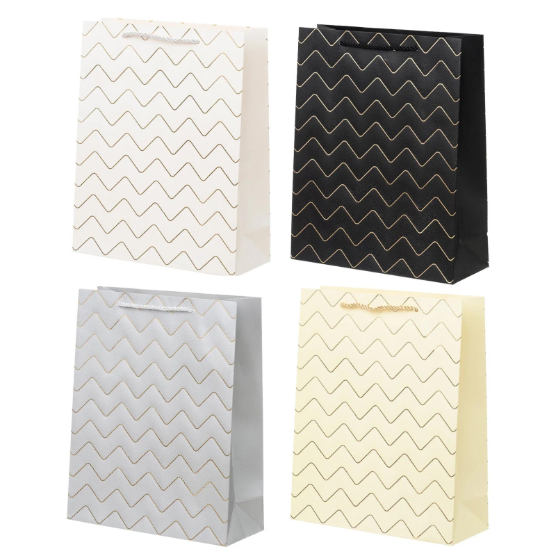 Подарочный пакет из картона в зигзагообразную тонкую золотую полоску . Позволяют перемещать предметы весом до 5-ти килограммов. Пакет компании Basir имеет плотность 240г/м?. Дополнительно ламинирован матовой пленкой для влагостойкости. Пакет достаточно жесткий и прочный, максимальная нагрузка, которую выдерживает пакет: 5 кг, с усиленным дном. Для переноски пакета имеются две ручки из крученого шнура. Данный товар поставляется в разных вариантах дизайна/цвета (без возможности выбора).