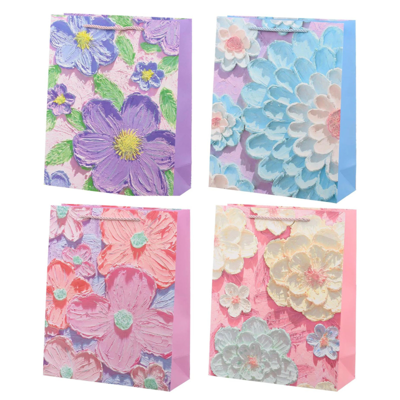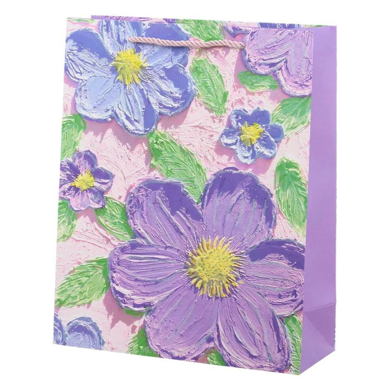 Подарочный пакет в нежных пастельных тонах из картона с романтичными цветами, так как будто кто-то нанес их мастихином . Позволяют перемещать предметы весом до 5-ти килограммов. Пакет компании Basir имеет плотность 240г/м?. Дополнительно ламинирован матовой пленкой для влагостойкости. Пакет достаточно жесткий и прочный, максимальная нагрузка, которую выдерживает пакет: 5 кг, с усиленным дном. Для переноски пакета имеются две ручки из атласной ленточки. Данный товар поставляется в разных вариантах дизайна/цвета (без возможности выбора).
