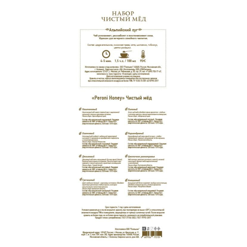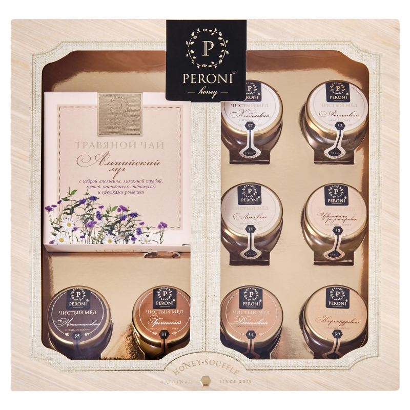 Набор из 8 видов жидкого меда и чая Альпийский луг - уникальная коллекция для ценителей натуральных продуктов. С этим набором вы почувствуете себя настоящим гурманом и научитесь различать все оттенки и грани вкуса свежего меда. 1. Мед натуральный, акациевый. 2. Мед натуральный, хлопковый. 3. Мед натуральный, липовый. 4. Мед натуральный, цветочное разнотравье. 5. Мед натуральный, каштановый. 6. Мед натуральный, гречишный. 7. Мед натуральный, дягилевый. 8. Мед натуральный, кориандровый. 9. Чай "Альпийский луг" - цедра апельсина, лимонная трава, мята, шиповник, гибискус, цветки ромашки. Пищевая ценность: 1372кДж/328Ккал. На 100г продукта: белки - 0,8 г, жиры - 0 г, углеводы - 80,3 г.