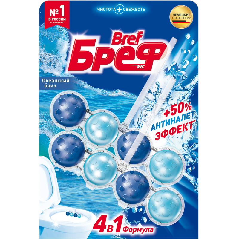 Блок для унитаза Bref сила-актив Океанский бриз (2 штуки в упаковке) Образует очищающую пену, которая обеспечивает гигиеническую чистоту; предотвращает образование известкового налета; помогает предотвратить повторное загрязнение; придает туалетной комнате свежий аромат океана после каждого смывания. Способ применения. 1. Повесьте Bref Сила-Актив под ободок Вашего унитаза; 2. Выберите положение блока как можно ближе к струе воды; 3. Замените блок, когда он закончится; Меры предосторожности. Вызывает раздражение кожи. Вызывает выраженное раздражение глаз. После работы тщательно вымыть руки. Использовать защитные перчатки / средства защиты глаз. При попадании на кожу: промыть большим количеством воды. При попадании в глаза: осторожно промыть глаза водой в течение нескольких минут. Снять контактные линзы, если вы ими пользуетесь или если это легко сделать. Продолжить промывание глаз. Хранить в недоступном для детей месте. Состав. > 30% анионных ПАВ, солей неорганических; 5-15% неионогенных ПАВ;