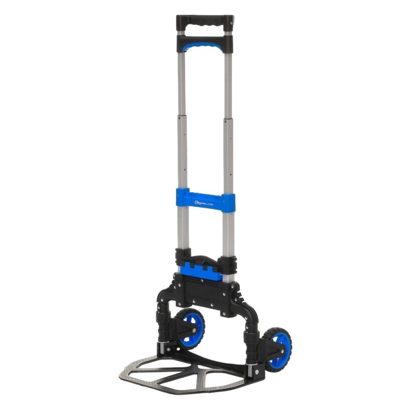Тележка ручная Стелла-техник FW-90SNA складная, алюминиевая. Грузоподъемность 68 кг. Тележка имеет: два колеса из термопластичной резины диаметром 126 мм., откидную полку и специальный 'зажим', который необходим для фиксации складного пластикового ящика МТ4 на тележке, во избежание его падения при транспортировке. Так же тележка комплектуется шнуром для фиксации груза, который удобно располагается на тыльной стороне тележки в специальном карман-пенале. Размер грузовой площадки: 280х390 мм. Габариты тележки в рабочем состоянии: 41х40х100 см. Высота ручки регулируется в двух положениях: 1. - 90 см; 2. - 100 см; Вес: 3,3 кг; Тележка поставляется в собранном виде, транспортные габариты: 390x5.5x64 см.