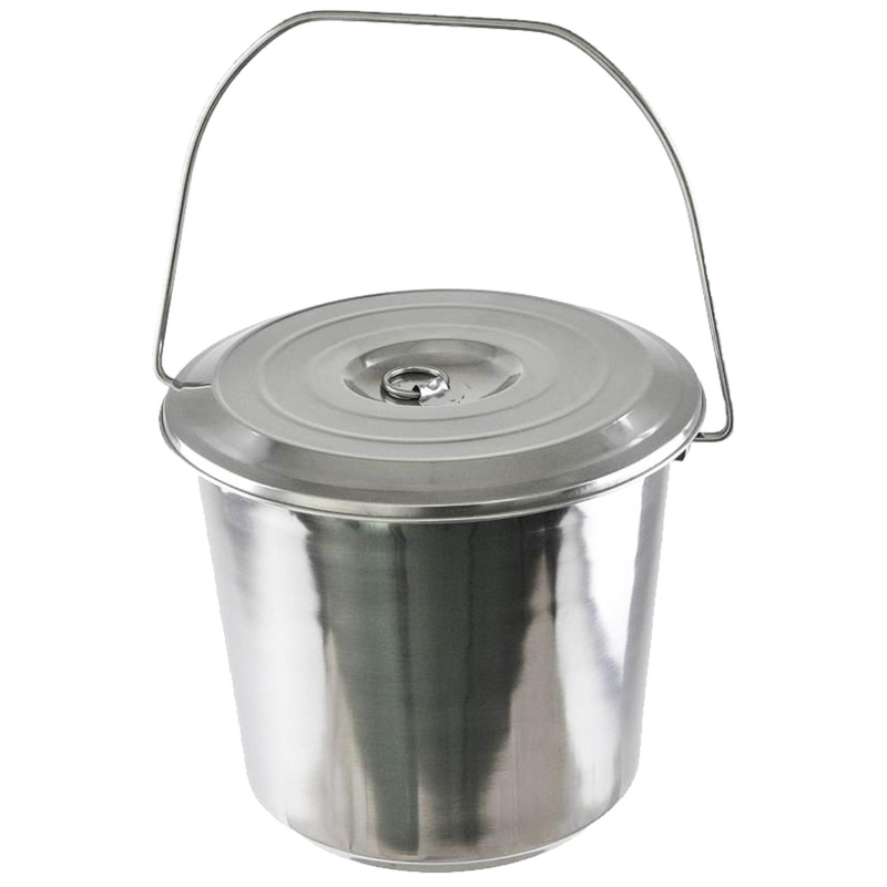 Ведро 10 л с крышкой. Ведро из нержавеющей стали объемом 10 л с крышкой - универсально в использовании. Оно найдет свое место в домашних работах, на производстве и стройке. Наличие плотно прилегающей крышки позволяет применять его для транспортировки и хранения жидких и сыпучих продуктов. Ведро из нержавейки объемом 10 л- безопасно и долговечно. Этот материал не окисляется и не выделяет токсичных веществ даже при контакте с горячими продуктами, имеющими кислотную или щелочную реакцию. Бесшовная технология изготовления исключает в изделии острые углы, в которых может скапливаться грязь, делает эти емкости легкими в мытье и гигиеничными в использовании. Случайное падение с высоты или удар не оставят на ведре вмятин и даже царапин. Это изделие рассчитано на долгий срок службы.