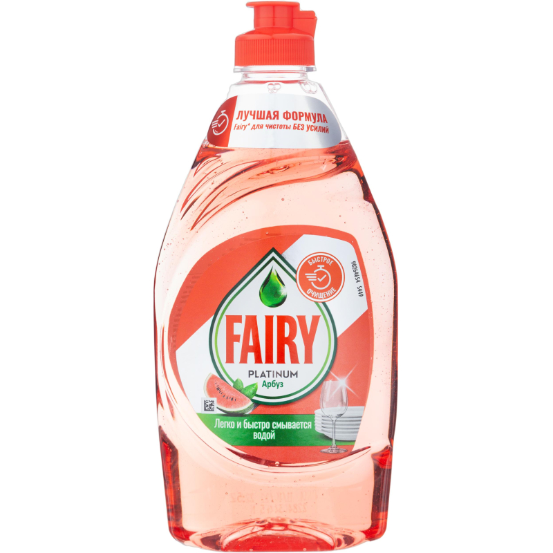 Используйте средство Fairy Platinum 'Арбуз' (Россия) для мытья посуды -- жидкость для мытья посуды с концентрированной формулой до 4 раз быстрее справляется со своей задачей, чем более дешевые средства производства P&G. Гель с ароматом арбуза очистит сложные загрязнения вне зависимости от температуры воды.