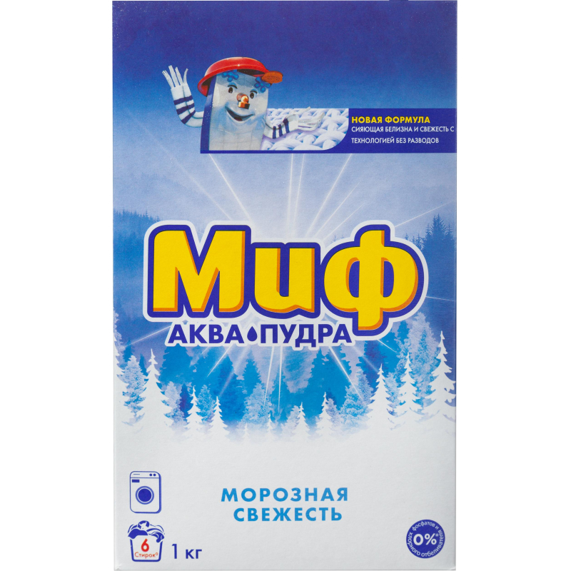 Стиральный порошок Миф Аквапудра Морозная Свежесть для белого белья Стиральный порошок Миф Аквапудра Морозная Свежесть для белых и светлых тканей - это новая, лучшая формула Миф для сияющей белизны, с технологией против разводов. Благодаря новой уникальной технологии Аквапудра, порошок для стирки Миф Аквапудра растворяется едва коснувшись воды, и моментально активируется: удаляет даже трудновыводимые пятна и придает одежде сияющую белизну, глубоко проникая в структуру волокон ткани. С помощью технологии против разводов, Миф помогает эффективно справляться с загрязнениями, не оставляя разводов на одежде и следов порошка даже в области швов. Только чистота и морозная свежесть!