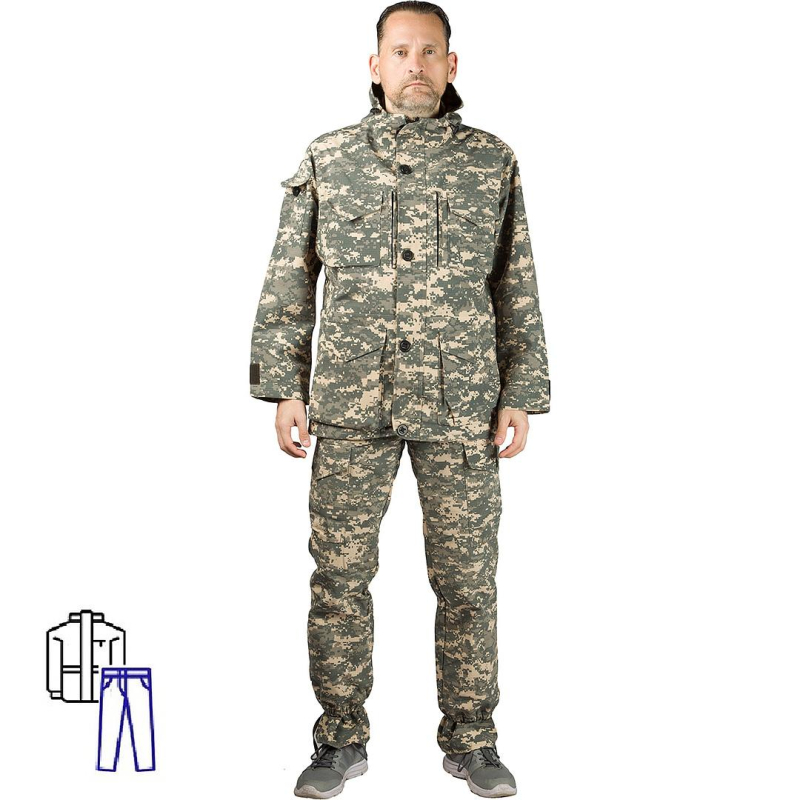 Костюм охранника мужской Гроза КБР серый (размер 54, рост 170-176). Костюм охранника модели Гроза КБР выполнен в цвете камуфляж/цифра серый. Подходит для размера 54 и роста 170-176. Костюм хорошо впишется в повседневный быт представителей силовых структур и отлично подойдет охотникам и рыбакам, а также туристам. Может использоваться всесезонно. Состоит из куртки и брюк. Ткань рип-стоп, состав 20% хлопок, 80% полиэстер. Куртка: - прямого кроя, к низу регулируется фиксирующей шнурком; - с центральной застежкой на молнию и ветрозащитным клапаном на пуговицах; - капюшон регулирующийся шнурком с фиксаторами; - рукава прямые с манжетами и двумя накладными карманами с клапанами; - верхние и нижние накладные объемные карманы с клапанами; застегивающиеся на пуговицах; - усиливающая ткань на локтевых зонах. Брюки: - зауженные, в низу на резинке; - на поясе с резинкой и шлевками; - застежка-гульфик на молнии и пуговице; - боковые карманы на передних половинках и накладные объемные карманы с клапанами; - усилительная ткань в передней области брюк. Костюм предназначен для защиты от общих производительных загрязнений, от механических повреждений, а так же имеет водоотталкивающую пропитку. Плотность ткани 210 г/м2. Соответствует стандартам ГОСТ 25295-2003.