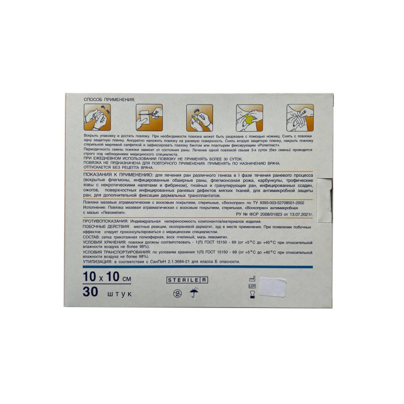 Повязка Воскопран Левометил, 10х10см, №30, 30шт/уп
