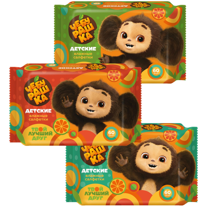 Влажные салфетки детские Чебурашка 60 штук в упаковке. Назначение и сферы применения: Салфетки незаменимы при смене подгузника в условиях отсутствия воды и мыла. Подходят для ежедневной гигиены детей любого возраста Эффект от использования: бережно очищают и увлажняют чувствительную кожу вашего ребенка с первых дней жизни. Удобны в применении, идеально подходят для использования в дороге. Меры предосторожности: только для наружного применения. Состав: нетканное полотно, пропитывающий лосьон. Состав лосьона: вода деминерализованная, цетеарил изононаноат, цетеарет-20, цетилстеарил, глицерин, глицерил стеарат, цетил пальмитат, цетеарет-12, пропиленгликоль, алкилполиглюкозид, феноксиэтанол, бензоат натрия, отдушка, ЭДТА, аллантоин. Не содержат спирта. Поставляются в различном варианте дизайна (без возможности выбора).
