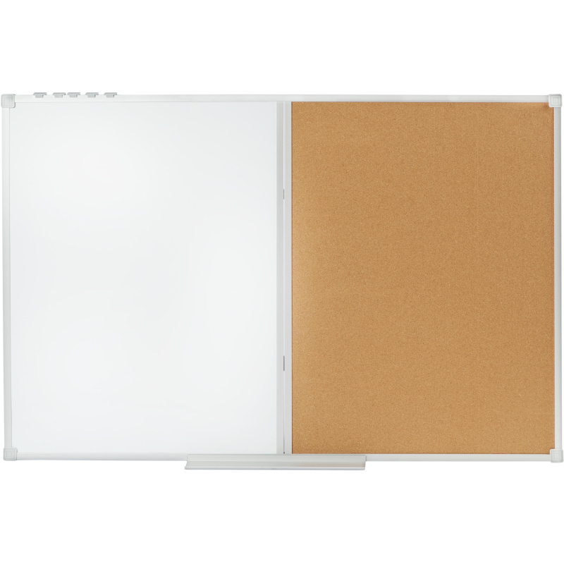 Доска комбинированная пробковая/ магнитно-маркерная Attache, размером 60х90см. Информацию можно размещать с помощью силовых кнопок, флажков и булавок, а также маркеров сухого стирания и магнитов. Рама и стык покрытий изготовлены из анодированного алюминиевого профиля. Оснащена полочкой для маркеров и силовых кнопок. Для удаления пленки потяните за верхний свободный угол, пленка легко отойдет от рабочей поверхности. При необходимости проведите вдоль рамы канцелярским ножом.