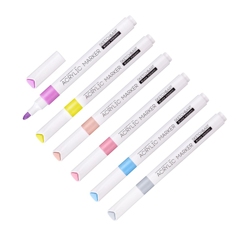 Набор из 6 акриловых маркеров "Sketch&Art" в пастельных цветах для рисования, декорирования, дизайнерских работ на любых поверхностях: холст, бумага, дерево, пластик, металл, камень, стекло, одежда, керамика. Корпус маркеров изготовлен из полипропилена - он легкий и ударопрочный. Плотно защелкивающийся колпачок обеспечивает долгую сохранность чернил от высыхания. Маркер имеет пулевидный наконечник из износостойкого волокна с шириной линии 1-3 мм. Нетоксичные пигментные чернила на водной основе с высокой степенью укрывистости быстро сохнут на поверхности, оставляя яркий след. Краски до высыхания можно смешать или растушевать кистью для достижения плавных переходов. Маркеры упакованы в картонную упаковку с эффектом Soft Touch и узнаваемым дизайном всей линейки "Sketch&Art". Размер: 105x145x15 мм.