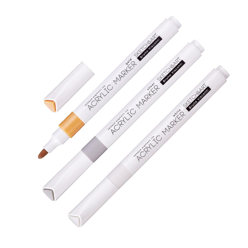 Набор из 3 акриловых маркеров "Sketch&Art" в золотом, серебряном и белом цвете. Маркеры предназначены для рисования, декорирования, дизайнерских работ на любых поверхностях: холст, бумага, дерево, пластик, металл, камень, стекло, одежда, керамика. Цвета: белый, серый, золотой. Корпус маркеров изготовлен из полипропилена - он легкий и ударопрочный. Плотно защелкивающийся колпачок обеспечивает долгую сохранность чернил от высыхания. Маркер имеет пулевидный наконечник из износостойкого волокна с шириной линии 1-3 мм. Нетоксичные пигментные чернила на водной основе с высокой степенью укрывистости быстро сохнут на поверхности, оставляя яркий след. Краски до высыхания можно смешать или растушевать кистью для достижения плавных переходов. Маркеры упакованы в картонную упаковку с эффектом Soft Touch и узнаваемым дизайном всей линейки "Sketch&Art".