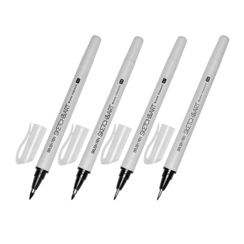Набор из 4-х ручек-кисточек "Sketch&Art" от Bruno Visconti с разной линией письма: 0,6 мм, 0,7 мм, 0,8 мм и 1 мм. Набор предназначен для тех, кто делает первые шаги в профессиональном рисования или уже имеет определенный опыт. Идеален для набросков, письма и каллиграфии. Наконечник изготовлен из высококачественного синтетического волокна. Чернила на водной основе стойки к выгоранию, спиртосодержащим средствам и воде. Плотно защелкивающийся прозрачный колпачок с клипом и корпус из полипропилена не пропускают воздух, что увеличивает срок эксплуатации ручек. Картонная упаковка содержит пластиковый ложемент с выемкой под каждую ручку, создавая дополнительный комфорт в работе и позволяя содержать набор в порядке.