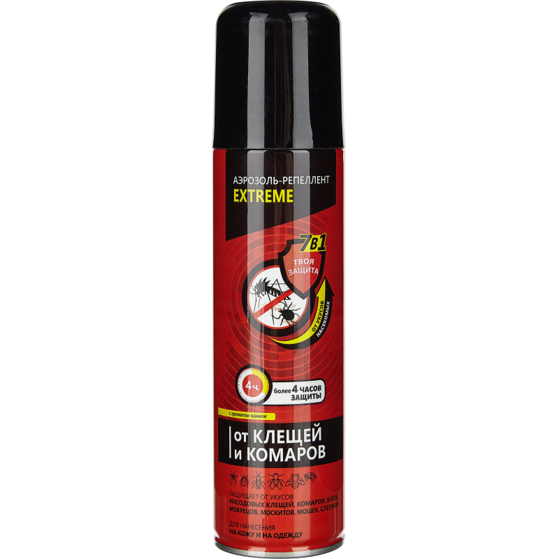 Средство от насекомых № 1 Репеллент Exteme 7в1 От всех видов насекомых аэрозоль 150 мл Назначение. Для защиты взрослых людей от нападения кровососущих насекомых: комаров (в том числе переносчиков возбудителей малярии), мокрецов, москитов, мошек, слепней, блох при нанесении на открытые части тела, одежду и другие изделия из ткани, иксоводых клещей (переносчиков возбудителей клещевого энцевфалита и боррелиоза) при нанесении на одежу и другие изделия из ткани. Способ применения. Использовать при температуре не ниже +10°C! Перед применением упаковку встряхнуть. Одежду и другие изделия из ткани обрабатывать на открытом воздухе. Располагать одежду и направлять струю средства по направлению ветра. Средство распылять на изделия с расстояния 20-25 см от них, держа упаковку в вытянутой руке. После обработки одежду просушить.