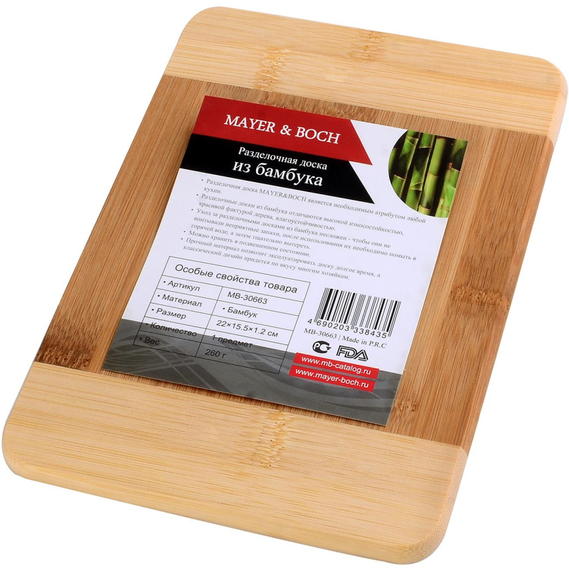Разделочная доска Mayer&Boch выполнена из бамбука, прочного и экологически чистого материала. Такая традиционная доска подходит для любых типов кухонных ножей, в том числе и керамических. Так как деревянные доски меньше других затупляют лезвия ножей, то это, несомненно, является еще одним плюсом этой бамбуковой доски. Размер: 22x15.5x1.2 см. Уход за бамбуковой доской несложен, после использования ее необходимо вымыть в горячей воде, а затем вытереть насухо. Красивая, а главное прочная и износостойкая, такая доска станет украшением любой кухни!